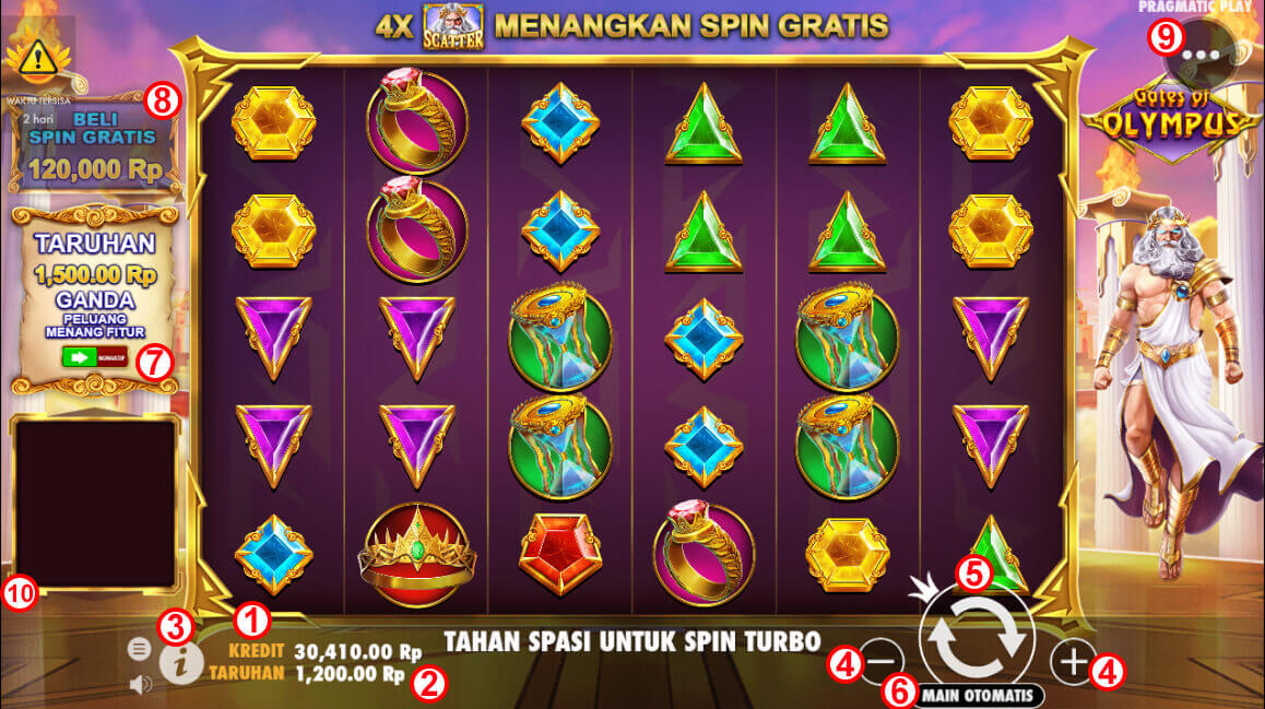 7. Taruhan Ganda. Berfungsi untuk menaikkan peluang mendapatkan symbol Scatter dan nilai betting akan mengikuti nilai yang tertera di menu Taruhan Ganda.
